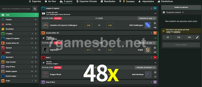 A aposta 48x oferece aos jogadores a experiência mais conveniente de apostas em eSports!